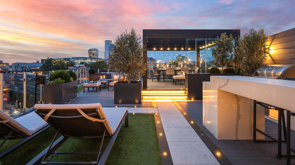 Opt for the 3 factors: Symmetry, materials and minimalism. We’ve been through ups and downs to be here and confirm to you that if you can design a symmetric picture, you can have it all. The others are the implements to add more to it. After mastering these 3 factors, your rooftop will scale the aesthetic beauty and even elevate the style of this living space.