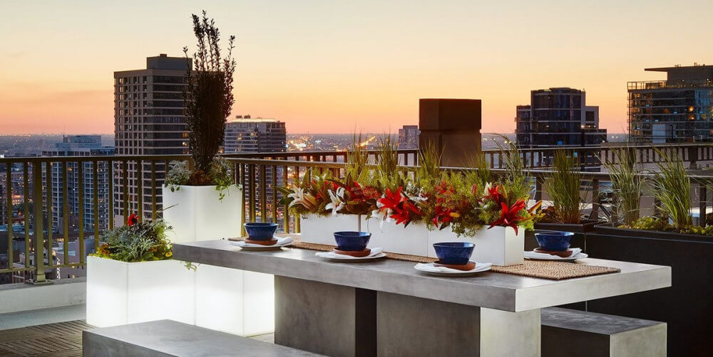 Greenery not only helps to rejuvenate your rooftop but also covers a natural and positive look to your near-the-sky space. Pay attention to the details that give your roof top a chance to become a beautiful garden. For example, hanging planters, shrubs in steel boxes, and planter ladder shelves. To make your garden more lively and colorful, flowers and large foliage plants would be perfect preferences.