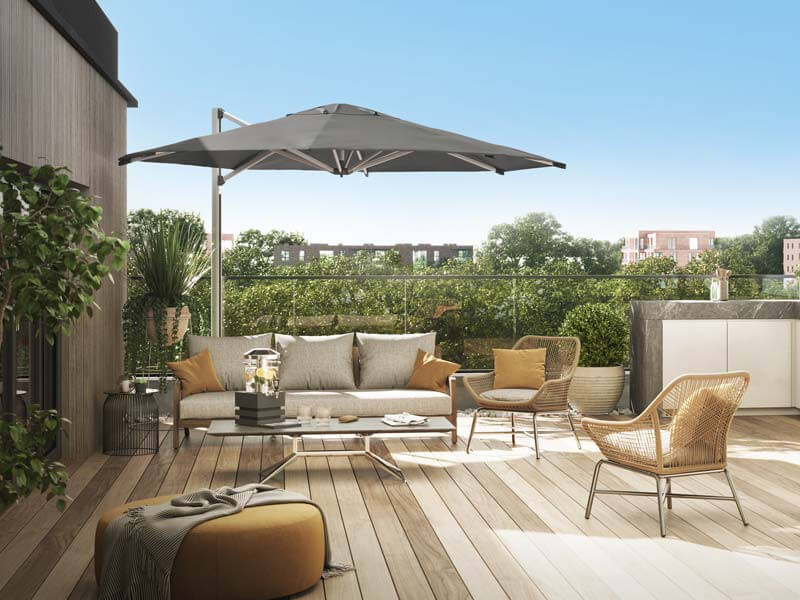 Tea time and conversations can not be well-done without a shield protecting you from UV rays and raindrops. That typical shield is the giant umbrella which is movable and easy to place at any corner.