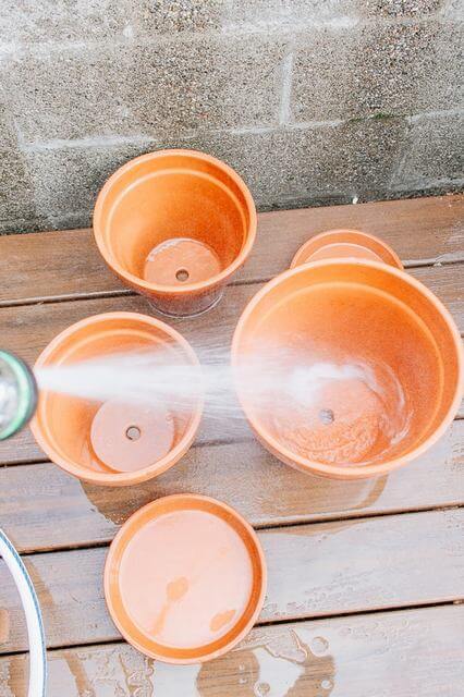 How to do: Make a mixing liquid with ingredients 1 cup of 5% acidic white vinegar in 3-4 cups of water and soak your clay pots for about 20-30 minutes. And then, gently scrub with a soft-bristled brush.