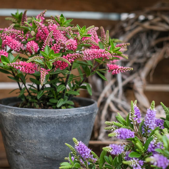 Hebe, also known as Veronica, is a compact shrub perfect for container gardening. Its glossy leaves stay attractive year-round, while summer flowers appear in shades of purple, pink, or white.