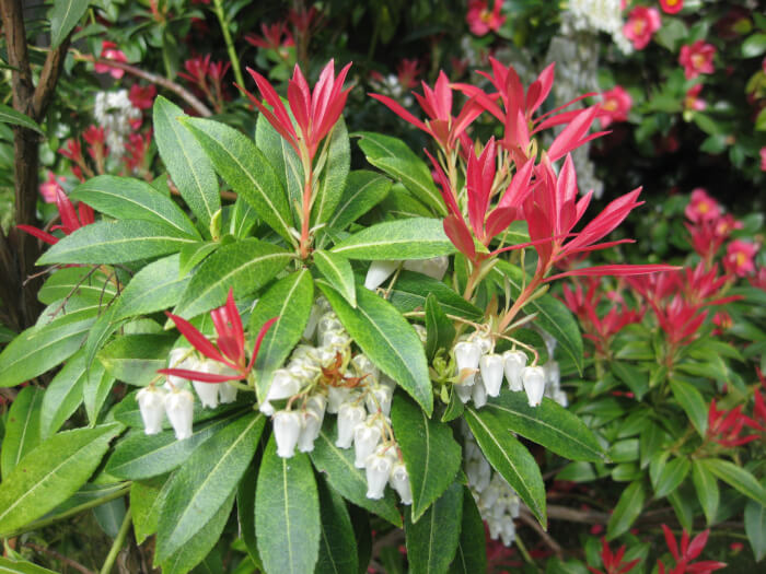Andromeda, also called Pieris Japonica, is a striking shrub with cascades of white or pink flowers. It requires acidic soil, so use a mix made for azaleas or camellias. Place it in partial sun and keep the soil evenly moist.