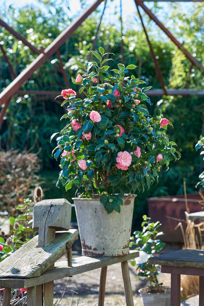 Camellia is one of the most beautiful flowering shrubs, prized for its rose-like blooms. It grows well in containers filled with rich, acidic soil. Place the pot in a spot with morning sun and afternoon shade for best results.