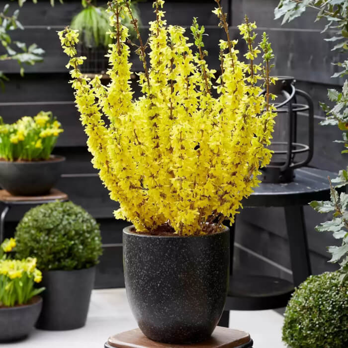 Forsythia is known for its early spring display of bright yellow blossoms. Dwarf varieties grow well in pots and make cheerful balcony plants. They prefer full sun for the best bloom production.