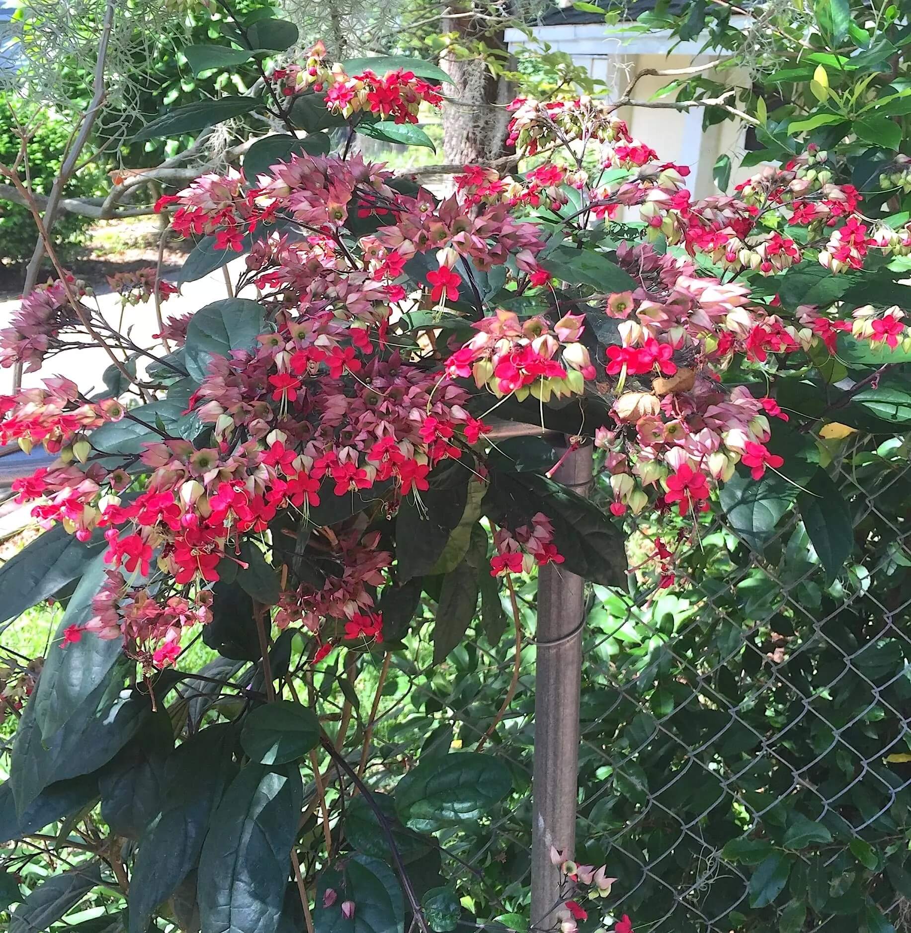 Bleeding Heart Vine features clusters of white bracts with bright pink petals at the center. It grows 4â5 feet tall, making it easy to manage on small gates or trellises.