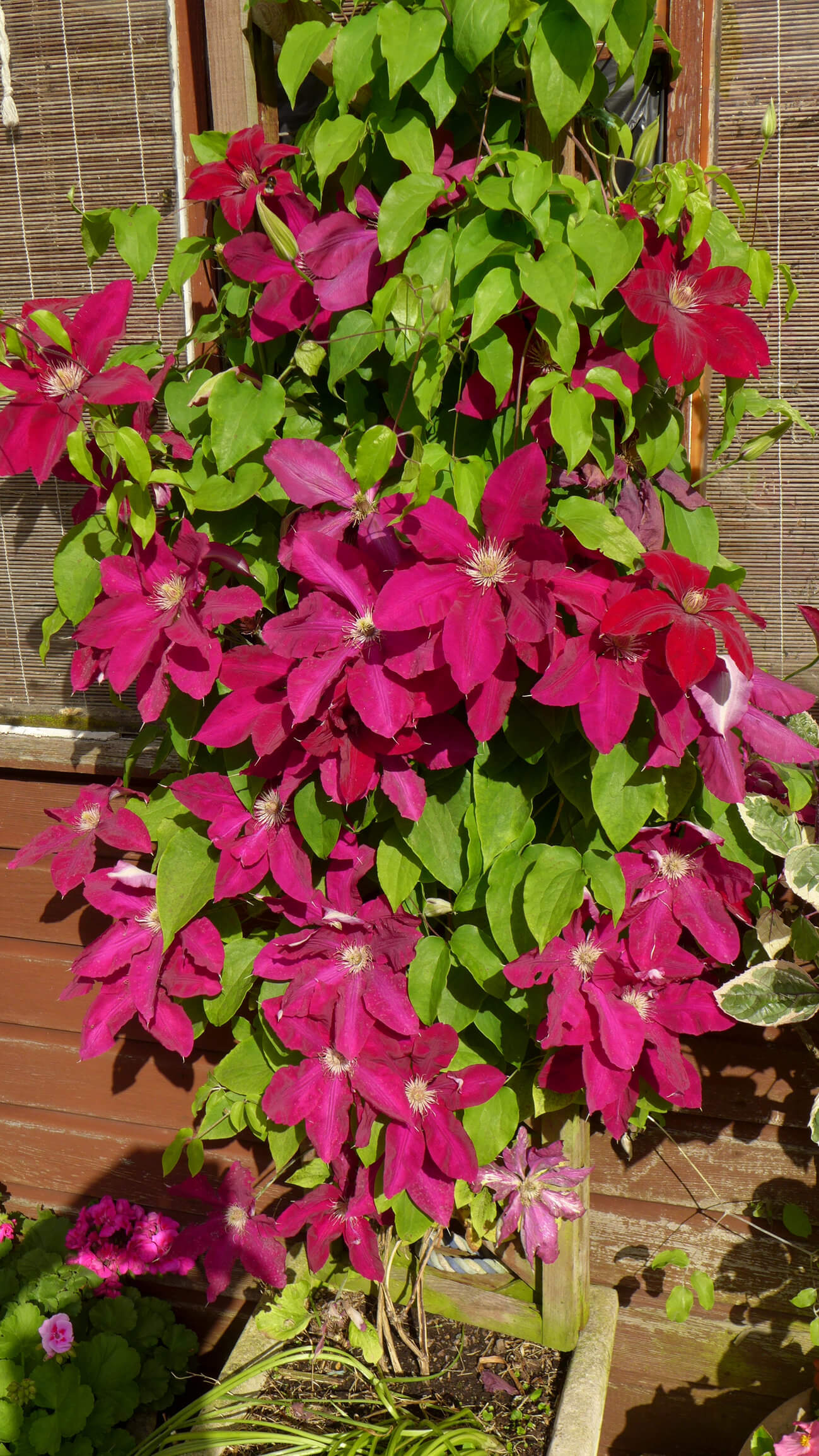 Rebecca Clematis dazzles with large, velvety red blooms edged in purple. This vine can grow 5â6 feet, making it manageable for smaller spaces. Plant it in rich, well-drained soil with its roots shaded and top growth in sunlight.