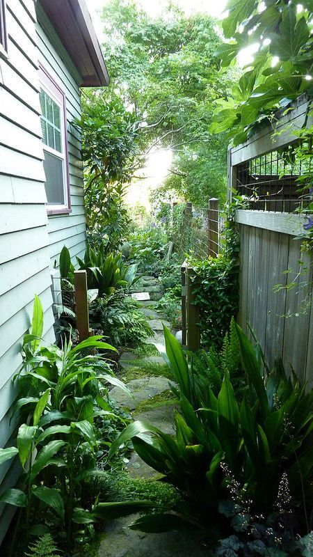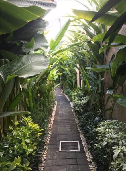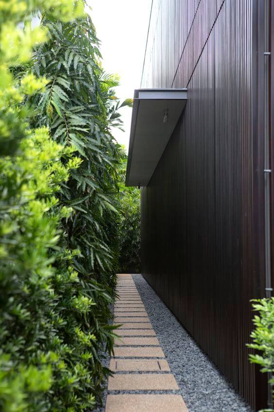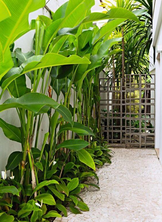 You can place a cozy chair or bench at the end to create a peaceful little hideaway. Framing the path with low-maintenance tropical greens keeps everything lush without overwhelming the narrow space.