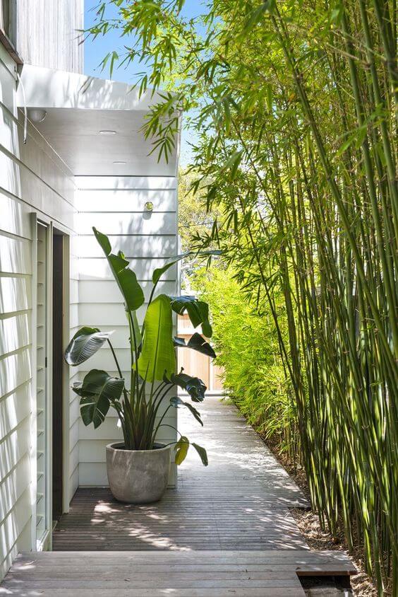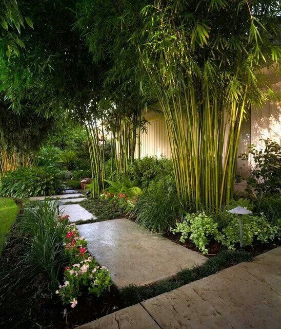 This tropical side yard with bamboo plant and ornamental grass feels calm, neat, and wonderfully inviting.