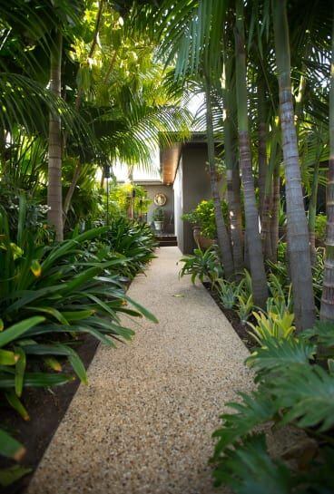 This tropical side yard with a black pathway creates the feeling of a secret jungle walkway right outside your door.