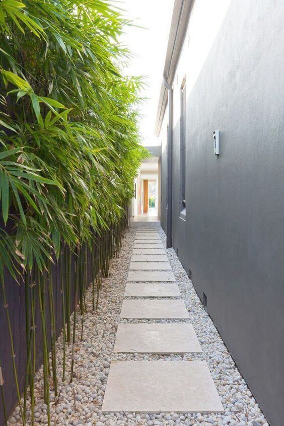 A tall line of slender bamboo creates a natural screen along the walkway, offering shade and privacy without crowding the narrow space. Smooth white stepping stones sit neatly on a bed of pale gravel, giving the area a clean, modern look.