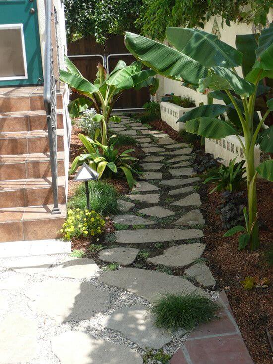 This tropical side yard with banana trees and paver pieces brings playful structure to a lush retreat. Broad banana leaves reach out dramatically over a winding stone path, casting fluttering shadows along the walkway.