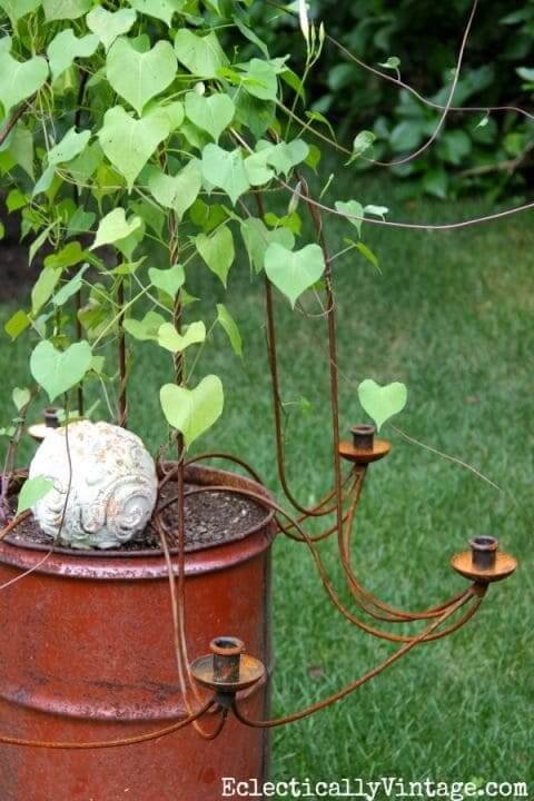 A vintage chandelier can become an unexpectedly elegant trellis when placed in a garden pot or flower bed. The curved metal arms give climbing plants like morning glories or sweet peas plenty of room to weave through and twirl upward.
