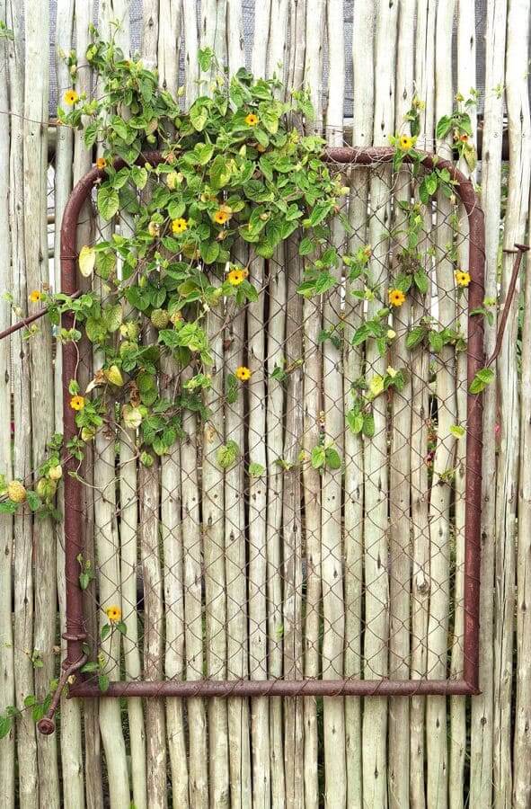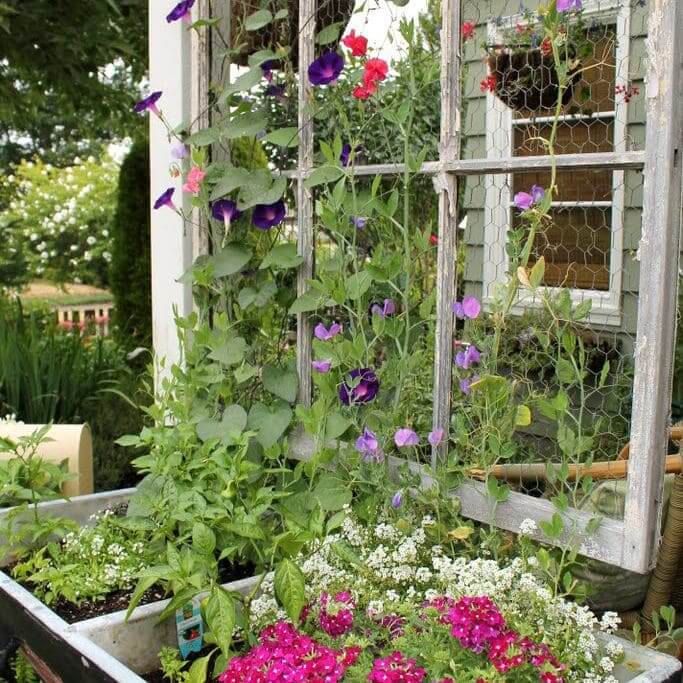 To create one, find an old window frame, remove the glass, and staple chicken wire or mesh across the back. Secure it upright near a raised bed or along a garden wall where vines can easily reach it.