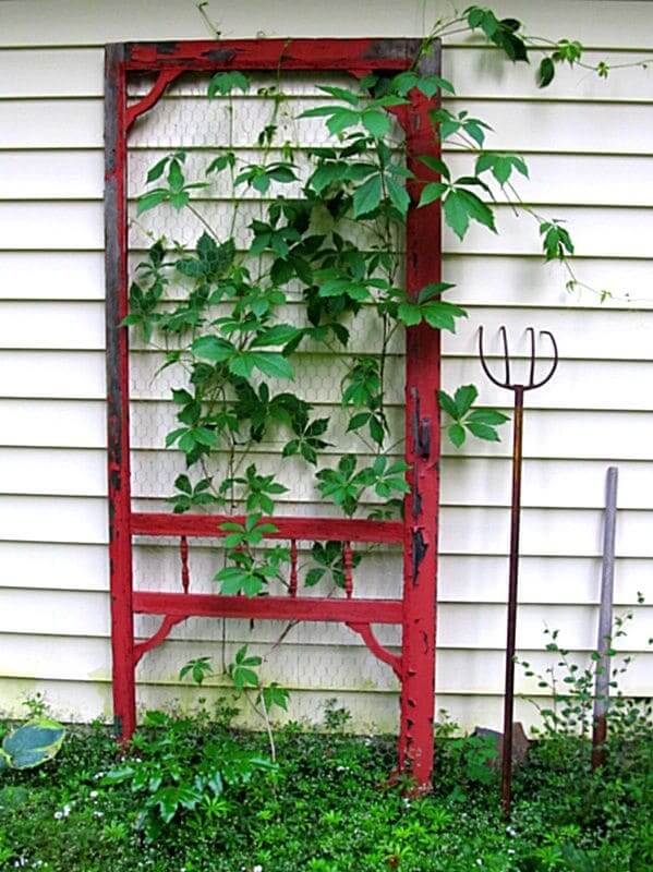An old screen door can easily become a charming vertical trellis with a splash of creativity. Its mesh backing makes the perfect climbing grid for vines and flowering plants, giving them plenty of space to stretch upward.