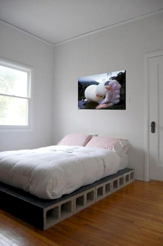 This clever bed frame made from cinder blocks proves that style doesn t have to cost a fortune. The sturdy blocks lift the mattress off the floor, creating a simple, modern platform with a clean and minimal vibe. It s also practical since the hollow spaces can be used to store shoes, baskets, or small items. To build one, arrange cinder blocks in a rectangle that matches your mattress size, making sure they re evenly spaced for balance. Place plywood or a flat board on top before adding your mattress for extra stability and comfort.