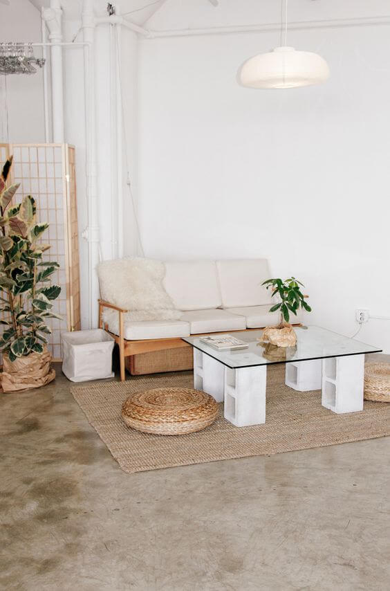 Here s a budget-friendly coffee table that still looks chic and modern. The base is made with simple cinder blocks, topped with a sleek glass sheet that instantly elevates the design. This combo adds a mix of industrial and minimalist style, making it a great fit for a living room or studio. To recreate it, stack four or more cinder blocks evenly, then carefully place a tempered glass top over them. You can even paint the blocks white or another neutral color to blend with your décor.