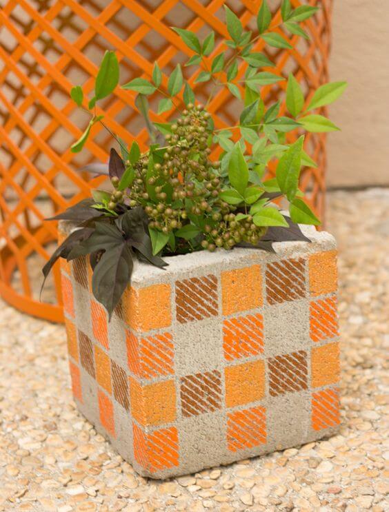 Here s a cheerful way to bring color into your garden or patio. This cinder block has been transformed into a planter with a playful checkered pattern in orange and brown, turning a plain block into a fun focal piece. It s small enough to sit on a tabletop, making it perfect for herbs, flowers, or even succulents. To recreate this, paint the block with outdoor acrylic paint and seal it for durability. Once dry, fill it with soil and add your favorite plants to brighten up any corner instantly.
