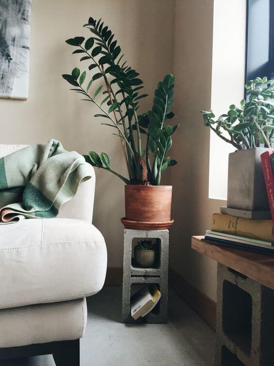 This simple cinder block stand brings a modern, rustic touch to your living room. By stacking one or two blocks, you instantly have a sturdy base to elevate your favorite potted plant. The hollow sections make great little cubbies where you can tuck in smaller plants, books, or decorative pieces. To make it more polished, you could paint the blocks or leave them raw for an industrial feel. It s an affordable and stylish way to give your greenery a spotlight in the room.