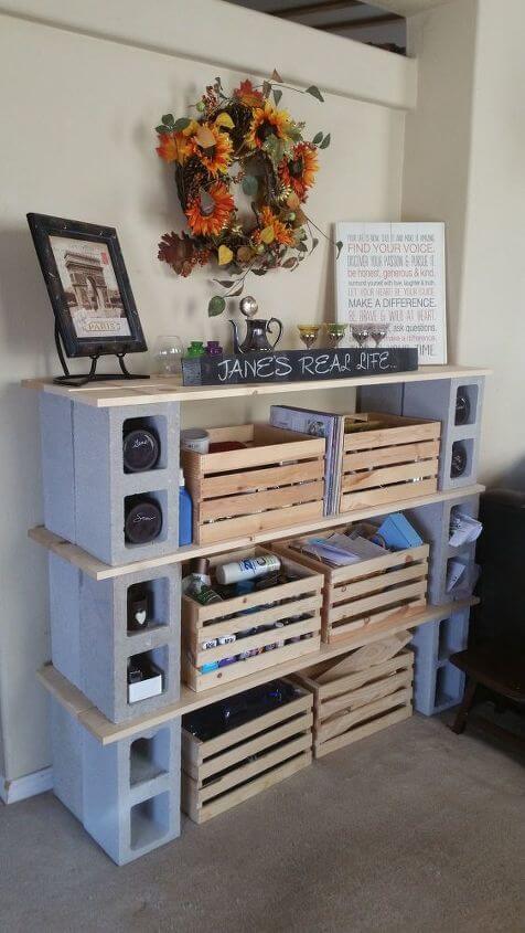 Here s a smart way to organize your things using just cinder blocks and wooden planks. The sturdy blocks act as the frame, while the planks provide multiple layers of storage. Wooden crates fit perfectly into the design, giving you extra compartments for everything from books to kitchen supplies. To recreate this look, simply stack the blocks on each side, place the planks across, and slide in baskets or boxes. It s a practical and stylish storage solution that you can build in under an hour.