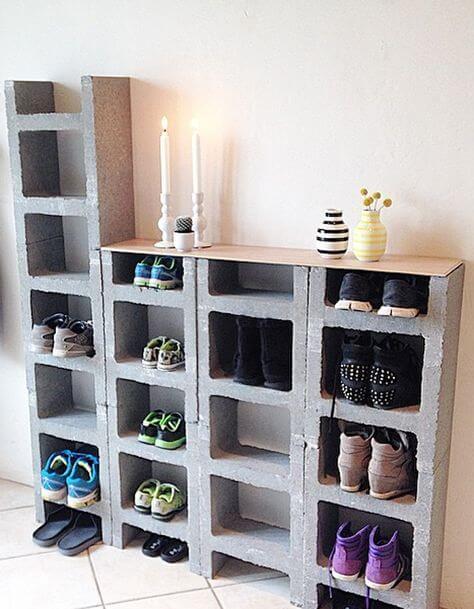 Here s a clever way to turn simple cinder blocks into a functional shoe rack. The hollow spaces in the blocks are perfect for tucking in pairs of shoes, keeping everything neat and visible. By stacking the blocks vertically and horizontally, you can adjust the design to fit your space. Add a wooden plank on top, and you instantly have a shelf for candles, plants, or décor accents. It s an easy project that keeps your entryway organized while giving it a modern, rustic vibe.
