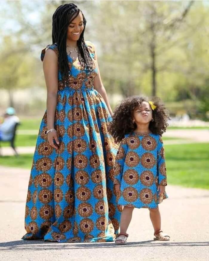Source: UnknownThis enchanting “mommy-and-me” duo brightens up the outdoors in their beautifully coordinated African print dresses. The vibrant blue fabric is adorned with striking, repeating rosette-like patterns in warm browns and golds.