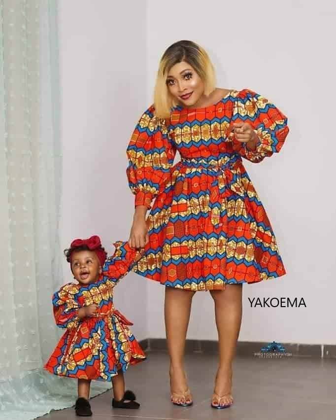 Source: YakoemaThis adorable mommy-and-me look features vibrant African print dresses that are bursting with joy! The rich orange and blue patterns are eye-catching, and the playful puff sleeves on both outfits add a touch of whimsy.