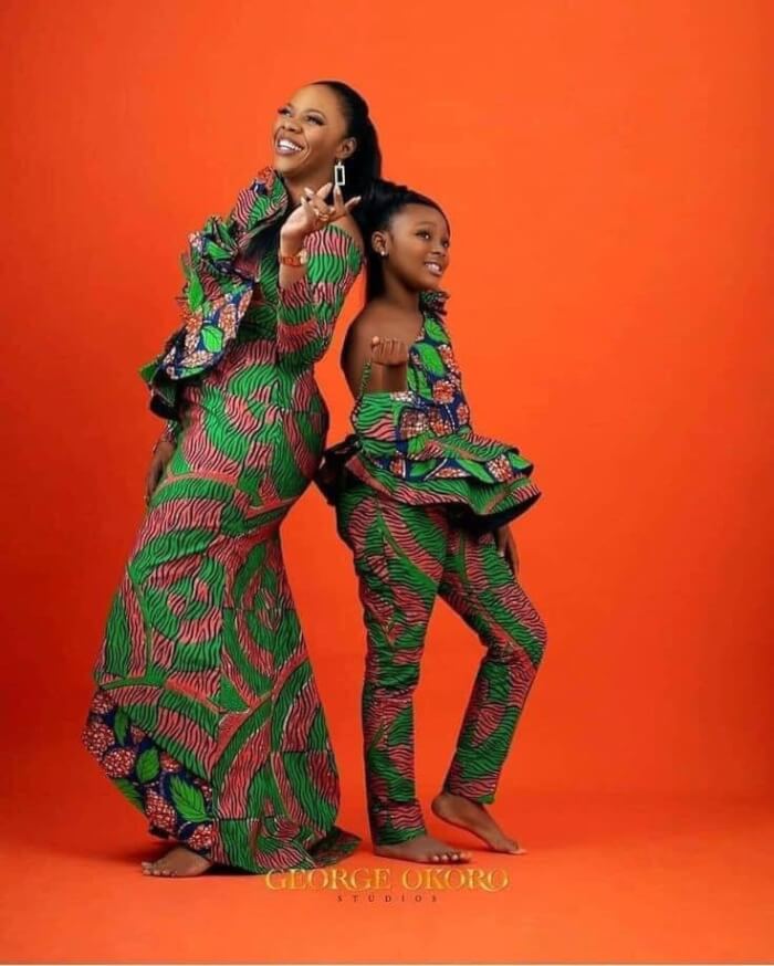 Source: George Okoro StudiosThis stunning mommy-and-me ensemble is a vibrant celebration of bold patterns and unique silhouettes. The striking green and red abstract print creates a dynamic visual while the ruffled details on both the mother’s shoulder and the daughter’s top add playful flair.