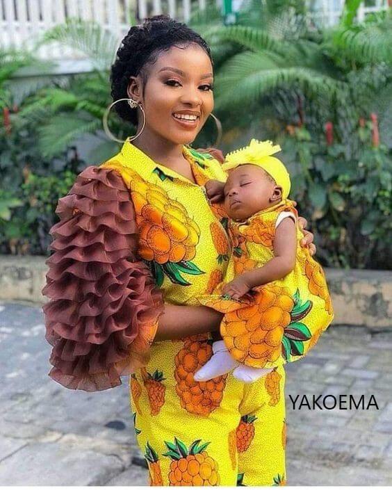 Source: YakoemaThis incredibly sweet mommy-and-me outfit is an absolute burst of sunshine and joy! Both mother and baby are adorned in a vibrant yellow fabric featuring playful pineapple and strawberry prints.