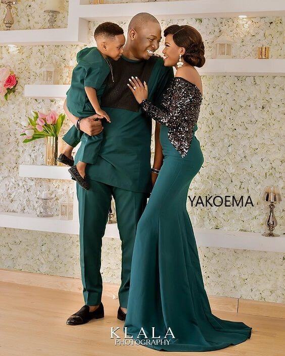 The mother stuns in a mermaid-style gown with a dazzling sequined off-the-shoulder bodice that adds a touch of glamour. Her husband and son perfectly complement her in stylish green attire, with the son looking adorable in a matching top and trousers.