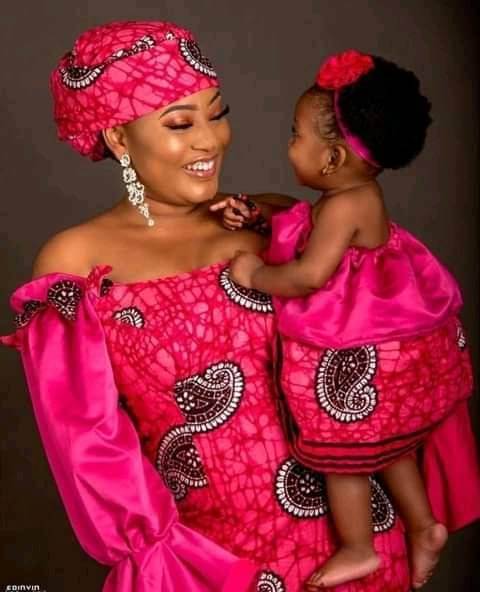 Source: UnknownThis vibrant “mommy-and-me” duo is absolutely radiating happiness in their matching hot pink outfits! The striking fabric features beautiful white and black paisley-like patterns that add a touch of intricate detail.