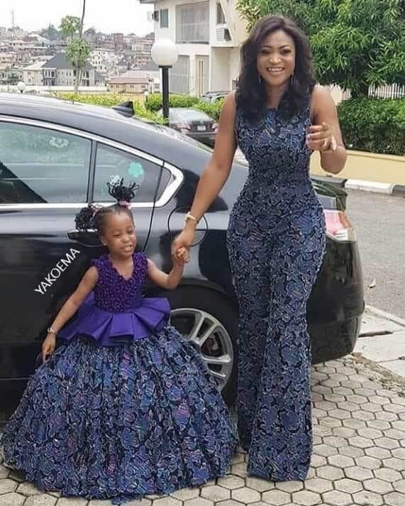 Source: YakoemaThis exquisite “mommy-and-me” duo absolutely shines in their coordinating deep blue and purple ensembles. The mother looks stunning in a sleeveless, form-fitting jumpsuit with an intricate lace-like pattern.
