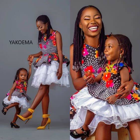 Source: YakoemaThis incredibly playful and stylish “mommy-and-me” set is a celebration of vibrant contrasts and fun details. Both mother and daughter are wearing matching tops featuring a chic black and white polka dot print with bold, colorful floral patterns.