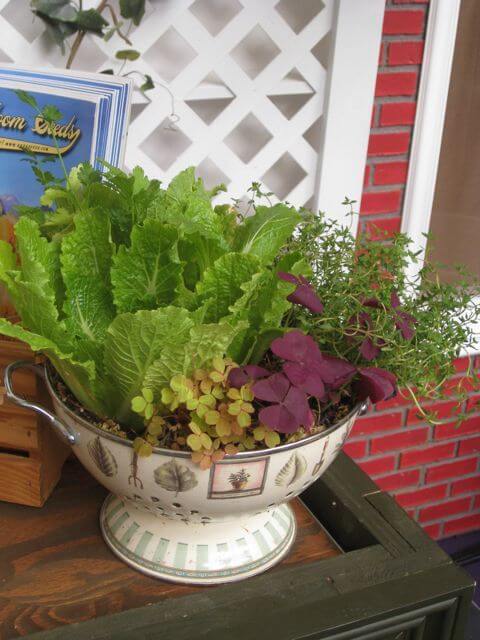 To use one, simply line the colander with landscape fabric or coffee filters, then add soil. You can plant small vegetables like cherry tomatoes, radishes, or even herbs.