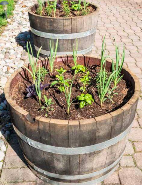 Old wine barrels make rustic, deep containers that are perfect for herbs and compact vegetables. Their wide surface allows you to plant several crops together, creating a little kitchen garden within arm s reach.