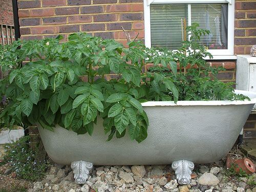 An old bathtub makes a quirky and spacious container for growing vegetables. Its depth is perfect for root crops like carrots, radishes, and even potatoes. To prepare it, drill drainage holes if needed and fill with soil.