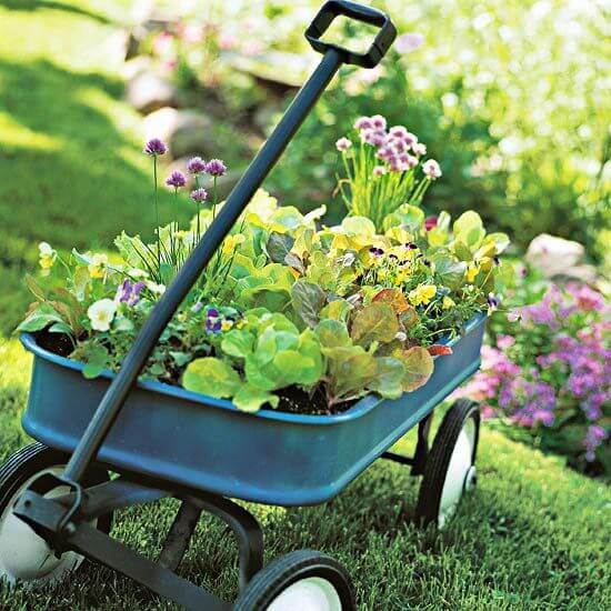 A wagon not only holds soil and vegetables but also gives you mobility to follow the sun. You can roll it around your yard, ensuring plants get the best light each day. Start by lining the base with landscape fabric and adding soil.