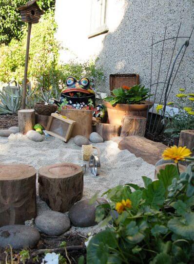 You can build your own version by clearing a patch, adding a few bags of sandbox sand, and placing logs for seats. Try tucking in some flowering plants and decorative rocks for texture.