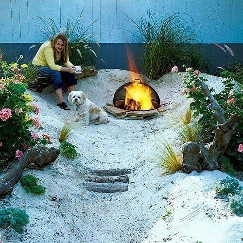 You can create this look by digging a shallow circle, adding a metal fire bowl, and surrounding it with beach sand and natural textures. It’s the perfect spot to unwind with your pup under the stars.