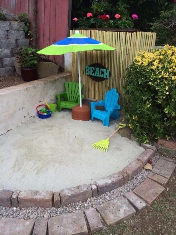 You can recreate this setup by filling the area with sand and using pavers or bricks to frame the space. Add a few bright chairs, a rake, and some beach toys to invite instant fun.
