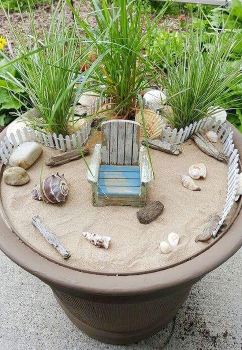 You can recreate this by filling a large pot with sand, adding ornamental grass for greenery, and decorating with miniature beach accessories. Place it on your patio or garden corner to enjoy a touch of shoreline magic without leaving home.