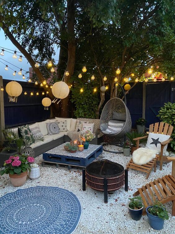You can recreate this by laying down white gravel, setting up a few mix-and-match chairs or lounge pieces, and weaving in lanterns or string lights overhead.