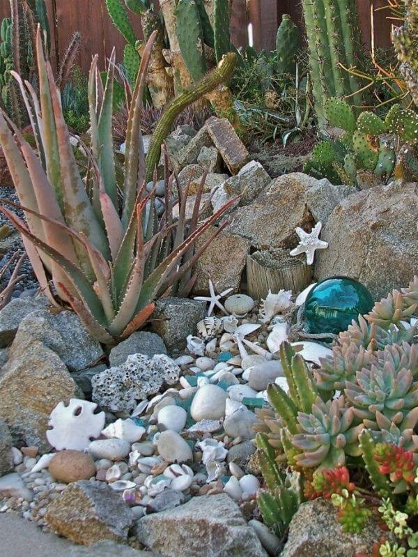 If you want a coastal vibe in a dry landscape, this stone garden is a perfect match. Succulents and cacti bring structure, while scattered seashells and white starfish add a gentle beachy rhythm between the rocks.