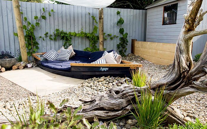 You could recreate this by repurposing an old rowboat, lining it with cushions, and placing it in a gravel patch for a beachy vibe. Let climbing vines and soft fabrics overhead bring in that breezy, sun-kissed mood.