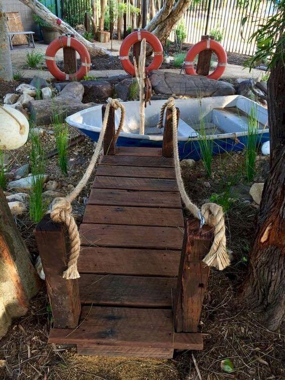 This beachy corner feels like a scene from a seaside dockyard. The rustic wooden bridge, complete with rope rails, invites you to cross over into your own backyard harbor.