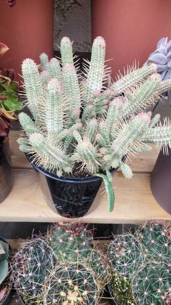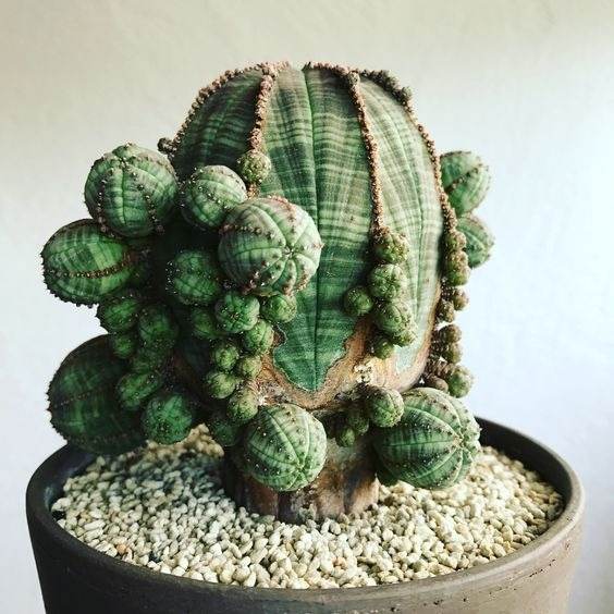 Euphorbia Horrida has spiny, barrel-shaped stems and a green to bluish-green color. It prefers a sunny location with well-drained soil and moderate watering.