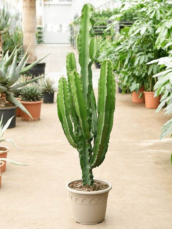 Euphorbia Grandicornis has green, three- or four-winged branches with a zigzag pattern and paired spines along the edges. It should be kept away from pests and children because of its toxic milky sap.