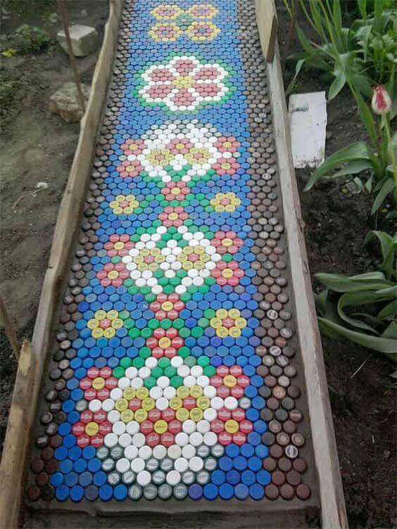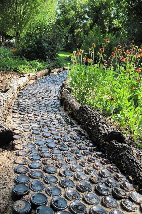 Bottle caps can make a colorful, eye-catching garden path. Arrange them into fun patterns and secure them with cement or resin. Collect caps in various colors to create a mosaic-like surface.
