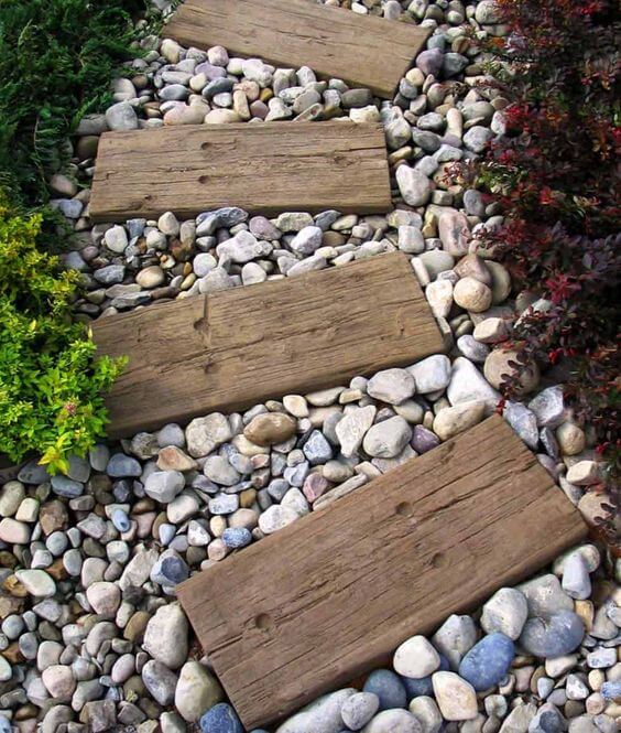 This blend of textures adds depth and interest to your garden design. Seal the wood with outdoor varnish to prevent decay. The mix of cool stone and rustic wood balances beautifully. It s a creative twist on traditional pathways.