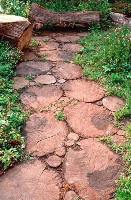 Combining stone and wood slices creates a path that feels warm and natural. Lay flat stones in a pattern, leaving space to fit wood slices between them.
