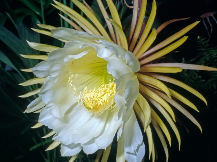 This cactus species rewards you with pure white, fragrant blooms that open only at night. Each flower can measure 7 inches across and fills the air with perfume until dawn. Place plants in bright indirect light indoors or outdoors in summer shade.